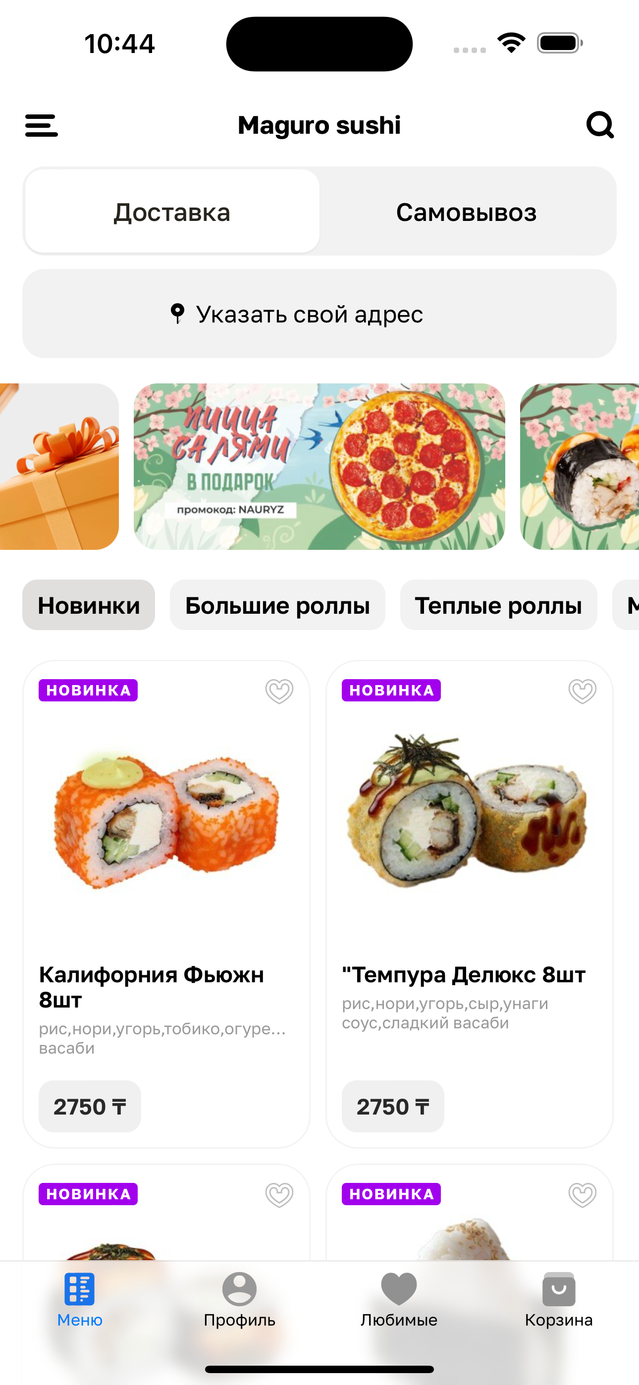 Фила 8шт, Эби ранч 8шт, Калифорния с крабом 8шт, Кунсей 8шт, Магуро темпура 8шт, Лосось темпура 8шт, Угорь темпура 8шт, Сенсей хот 8шт, Пицца маргарита 30см, Пицца куриная 30см,